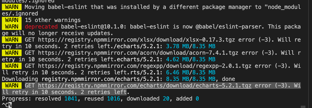 (2) GET https://registry.npmmirror.com/echarts/download/echarts-5.2.1.tgz error (-3). Will retry in 10 seconds. 2 retries left