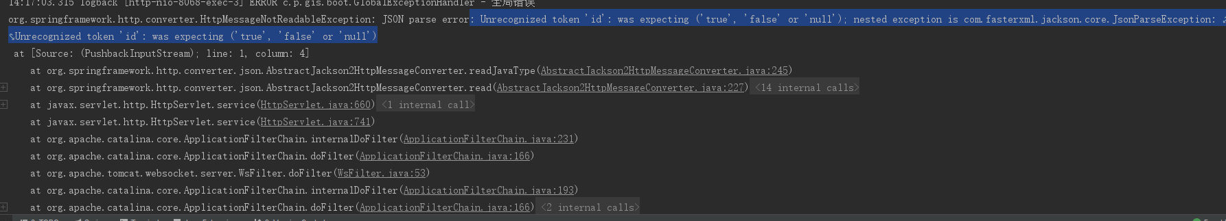 另一个问题是,在请求时,出现了这么一个错误: Unrecognized token ‘id’: was expecting (‘true’, ‘false’ or ‘null’); nested exception is com.fasterxml.jackson.core.JsonParseException: Unrecognized token ‘id’: was expecting (‘true’, ‘false’ or ‘null’)