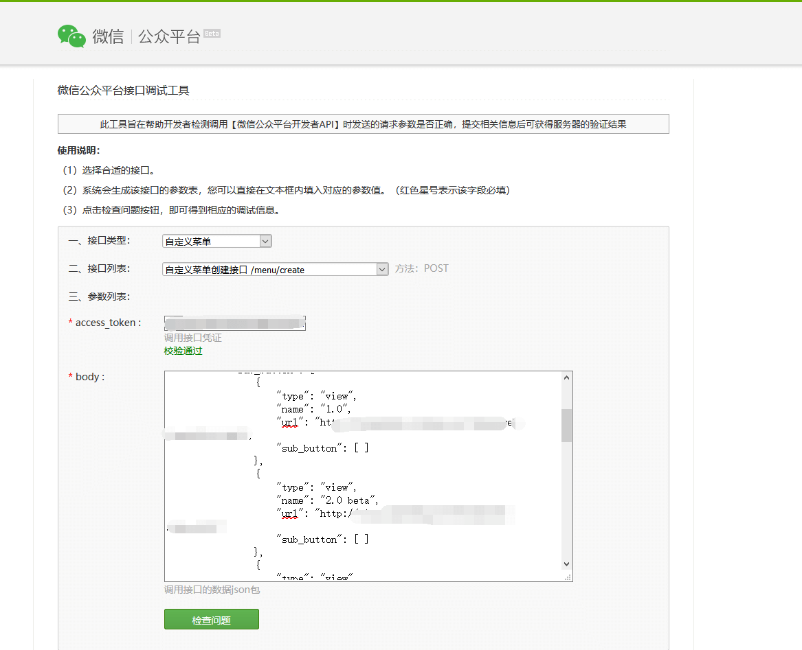 选择自定义菜单->自定义菜单创建接口/menu/create,填入access_token,body中填入菜单的json字符串,如下内容。
