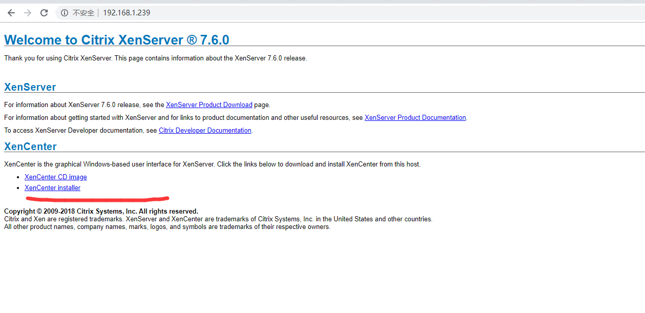 用浏览器打开安装了XenServer的服务器地址,这里我使用192.168.1.239,会自动提示下载XenServer客户端,选择XenCenter installer下载。