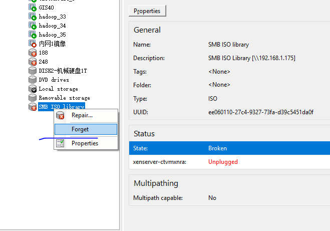 SR也就是存储库,比如我为了在虚拟机上安装虚拟机,新建了一个存储,存储里面放了几个iso文件,但是我想删除这个存储。