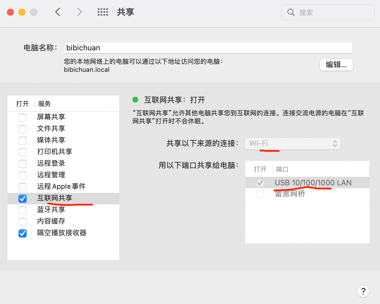 3.MACOS通过网线共享网络 1.首先mac的LAN配置成DHCP;2.然后在mac笔记本上把wifi的网络共享给LAN