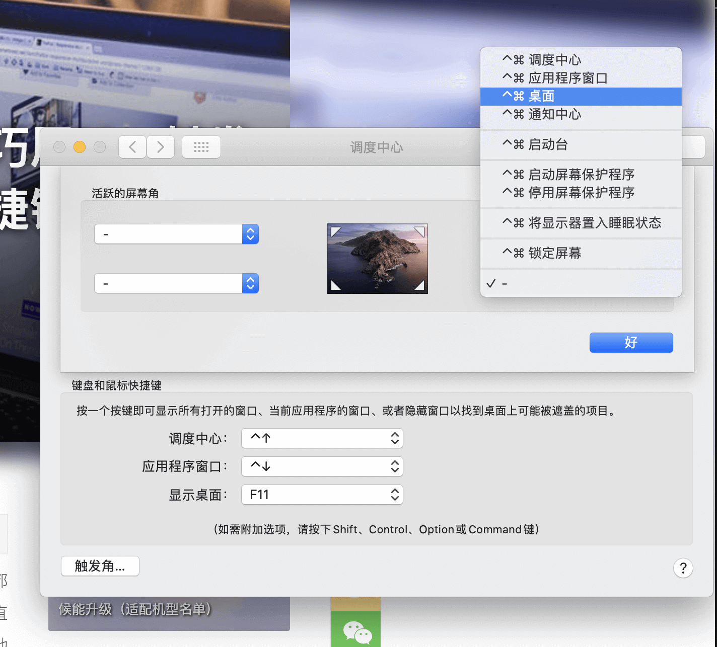 在window上,回到桌面,一般都挺简单的,就是点击左下角的那个小小的透明条,就可以快速的切换回桌面了,但是Mac默认是没有启用这个功能的,需要在系统偏好设置->调度中心->触发角中启用相应的功能才可以。