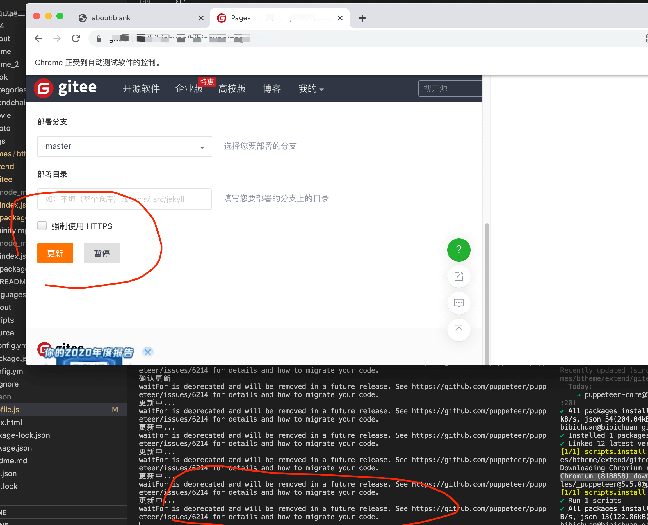 3.脚本解决 gitee-page 无法自动更新 (这里提到了gitee无法自动更新的问题,以及如何解决,主要就是解决了借助于puppeteer进行了登陆,以及更新按钮点击事件的模拟)