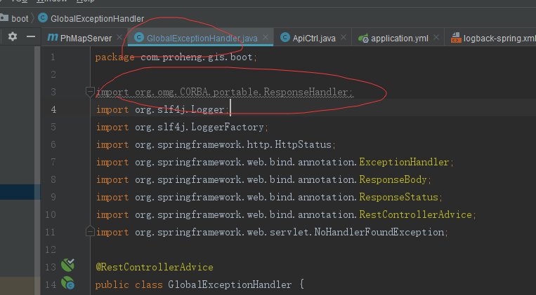 刚开始觉得莫名其妙,后来打开GlobalExceptionHandler类一看,原来引入了org.omg.CORBA.portable.ResponseHandler,虽然最后没有用上,但是还是影响了编译。