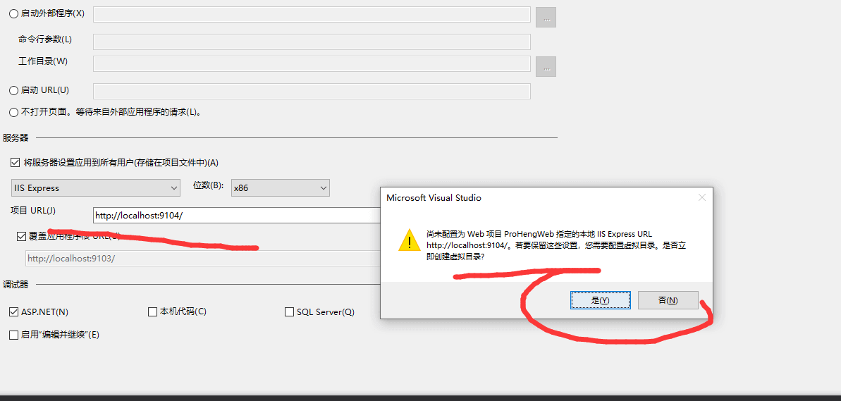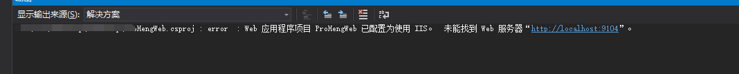 解决完上面的权限问题之后,就出现了这样的问题:Web 应用程序项目 ProHengWeb 已配置为使用 IIS。 未能找到 Web 服务器“http://localhost:9104”