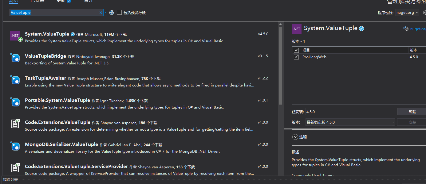 这是因为没有ValueTuple,这个引用,所以只需要使用NuGet进行安装就好了。