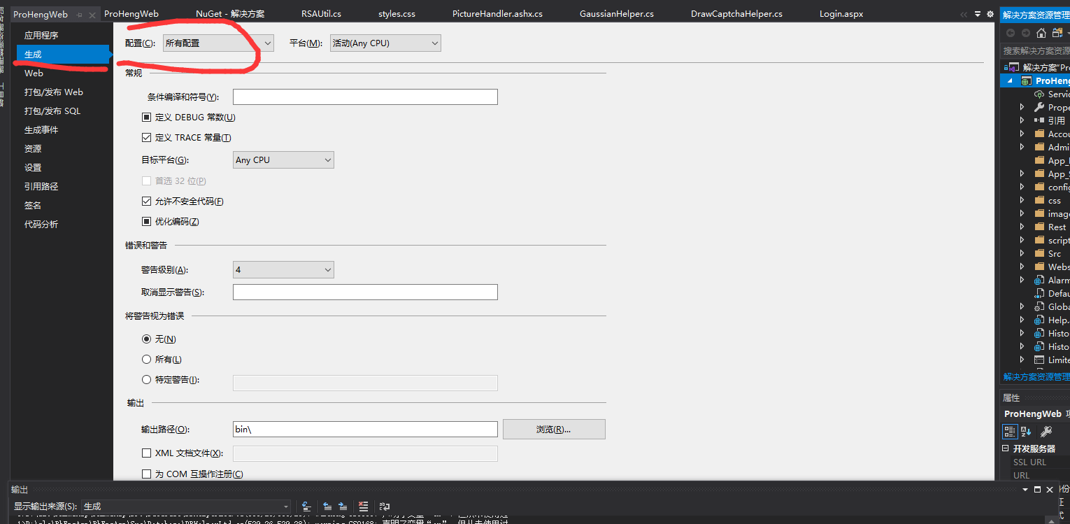其实就是要选择项目右键,然后选择属性->生成,然后就是要选择全部配置