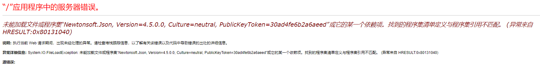 3.未能加载文件或程序集“Newtonsoft.Json, Version=4.5.0.0, Culture=neutral, PublicKeyToken=30ad4fe6b2a6aeed”或它的某一个依赖项。找到的程序集清单定义与程序集引用不匹配。 (异常来自 HRESULT:0x80131040)