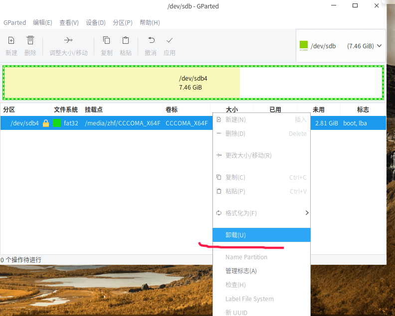 打开自带的Deepin分区工具,然后选择插入的U盘,然后选择卸载,将优盘进行卸载。