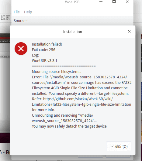 (3) in source image has exceed the FAT32 Filesystem 4GiB Single File Size Limitation and cannot be installed。You may now safely detach the target device。