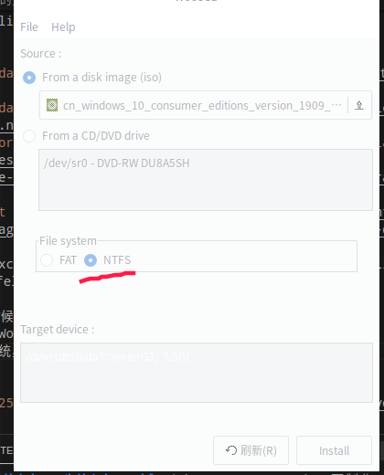(2) 选择windows文件的iso,选择格式化的磁盘,注意格式化为NTFS,如果选择Fat32可能会出错。