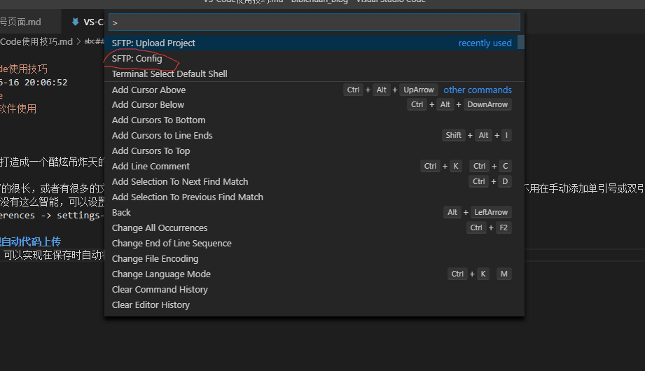 配置编写完成之后,Ctrl+Shift+P,选择SFTP:Upload,确定,然后就可以使用Ctrl+s保存代码到远程服务器了。