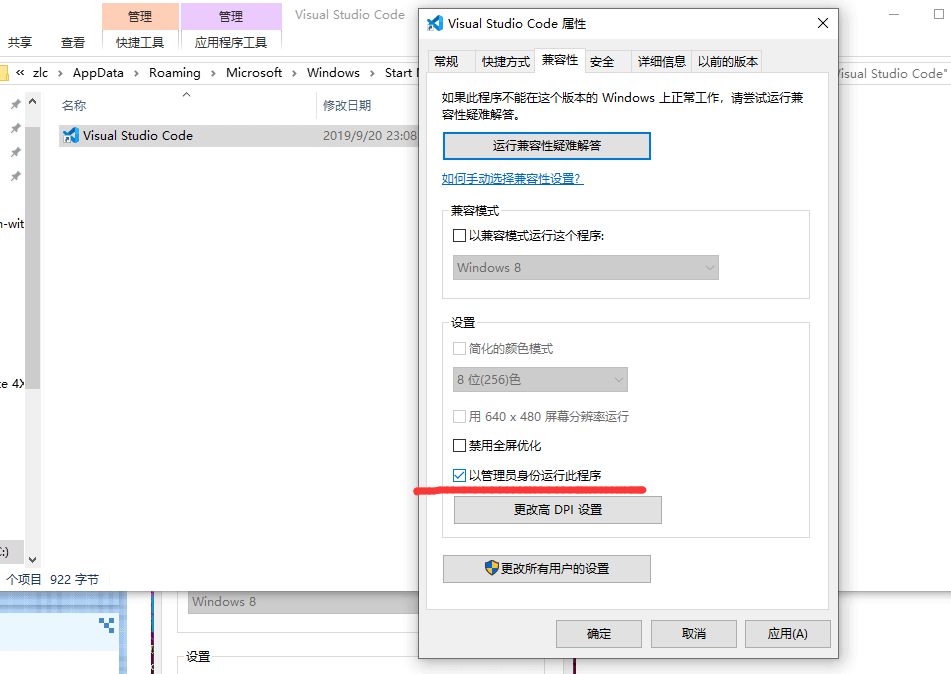 右键点击vscode启动图标,或者是启动的快捷键,选择兼容性,将“以管理员运行此程序”选项选中。