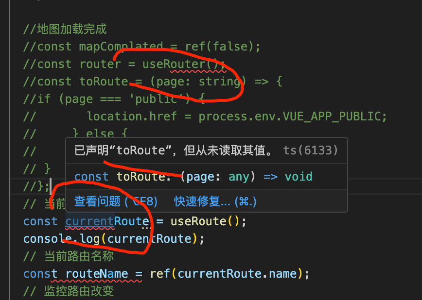 我使用vite+ts开发代码的时候,在vue文件中,明明注释掉了相关的代码,但是还是会提示有错误,让人头大。而且更加诡异的就是,明明已经将代码注释或者删除了,但是错误提示里面还是有一个原先的代码存在,比如下面图中的 toRoute明明不存在了,但是还是说未使用。