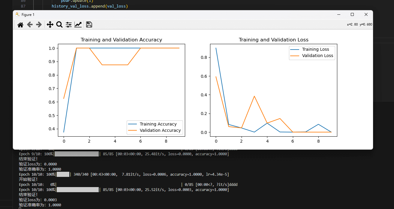 这里可以看到,验证集的准确率都是 100% 了,感觉有些不正常,这个问题但是跑出的模型倒是能用,这个待以后再探讨。