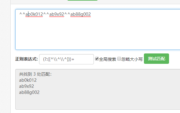 需求:”ab0k012ab9x92ab88g002”,这个字符串中,分别将ab0k012,ab9x92和ab88g002捕获到一个分组里面,该如何做?