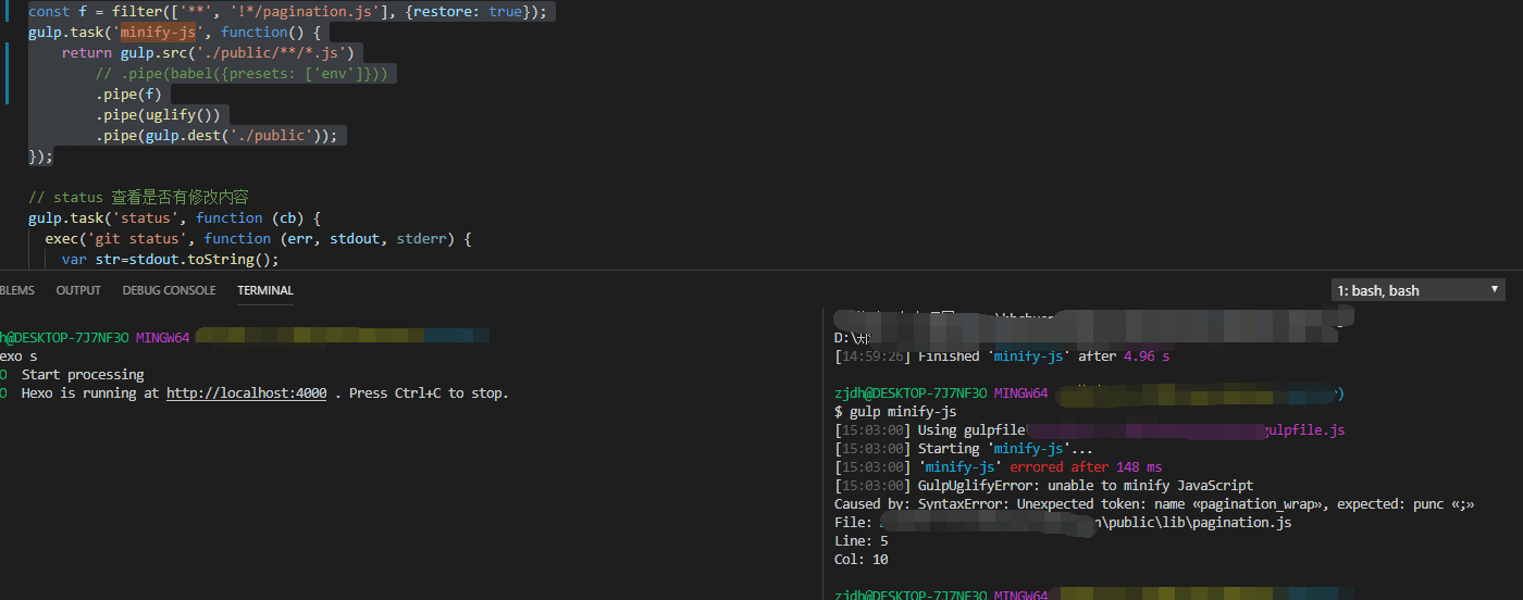 (1) 默认的gulp.src中可以通过“./public/*/.js”这种形式包含处理的文件,也可以使用在文件前面加一个!,排除不想处理的文件比如:“!./public/js/src/pagination.js”。gulp默认支持glob格式,排除语法为!。这种方式有点问题: