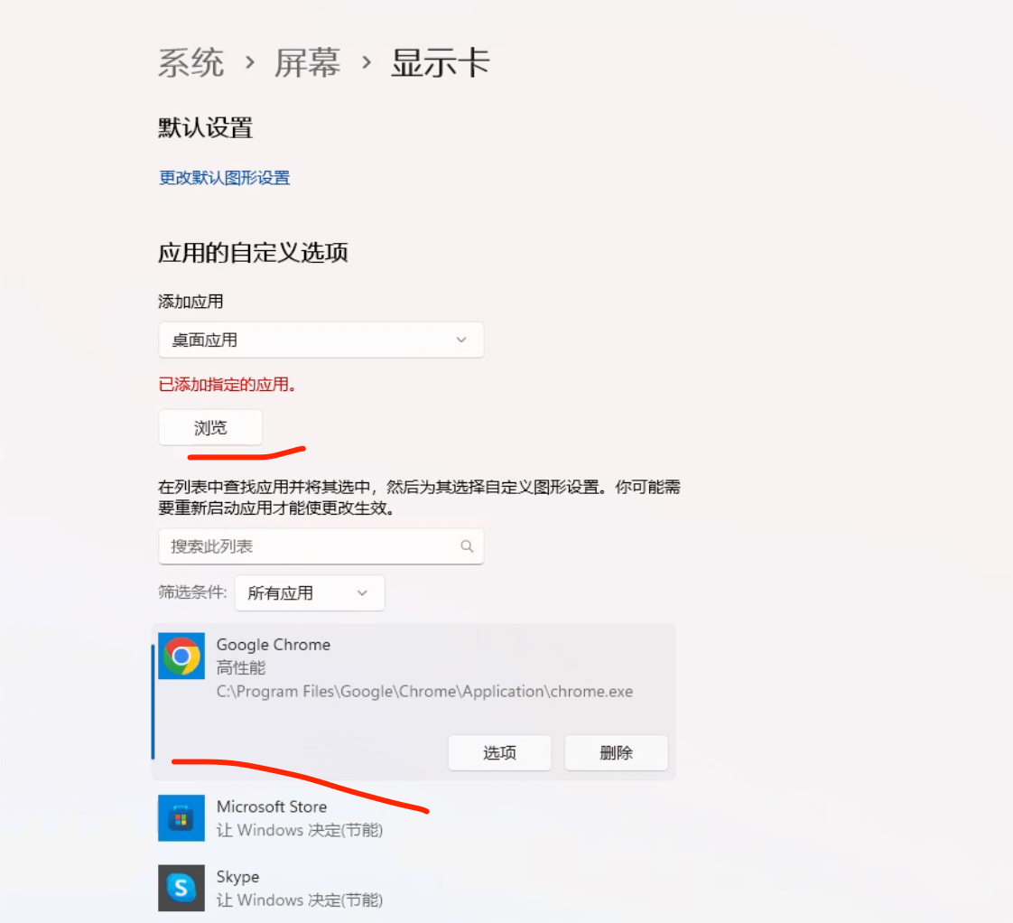 打开win11设置,然后选择系统-》屏幕——》显示卡,浏览应用,然后选择Chrome,然后右键选项,选择高性能模式。