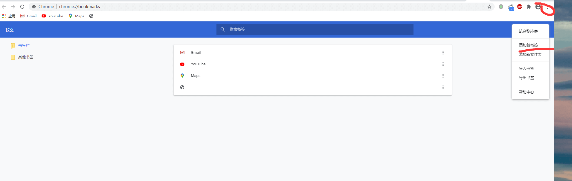 将打开下面这个书签管理窗口,然后名称随便写,网站输入下面的内容,保存。