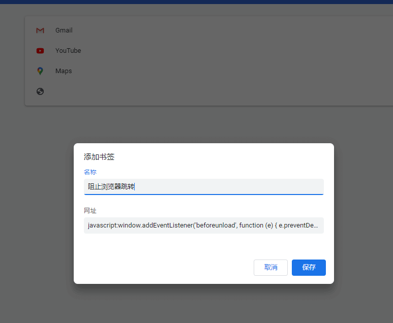 解决方法就是使用书签管理器监听beforeunload事件,点击【右上角一排竖点】->【书签】->【书签管理器】->【右上角一排竖点】->【添加新书签】