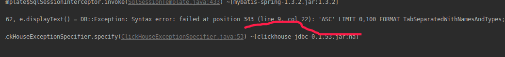 Syntax error: failed at position 343 (line 9, col 22): ‘ASC’ LIMIT 0,100 FORMAT TabSeparatedWithNamesAndTypes;