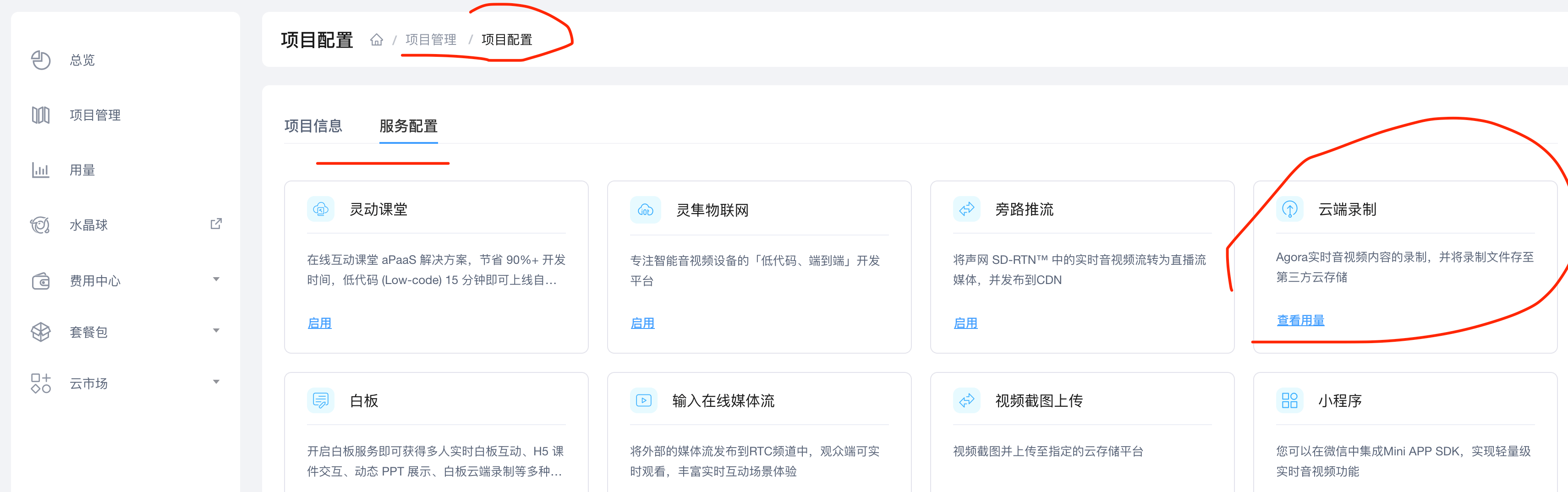 在项目管理,配置里面,打开云端录制功能。