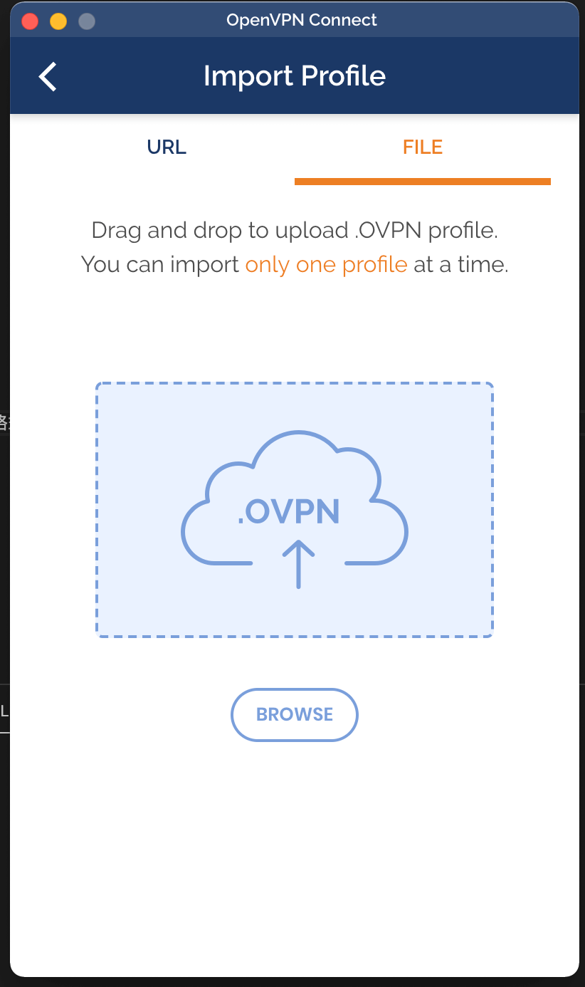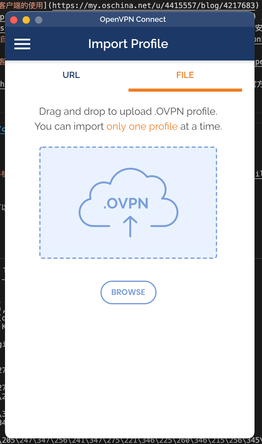 (2) 打开界面,选择倒入profile文件,选择ovpn文件格式,然后倒入之后,直接连接就可以了