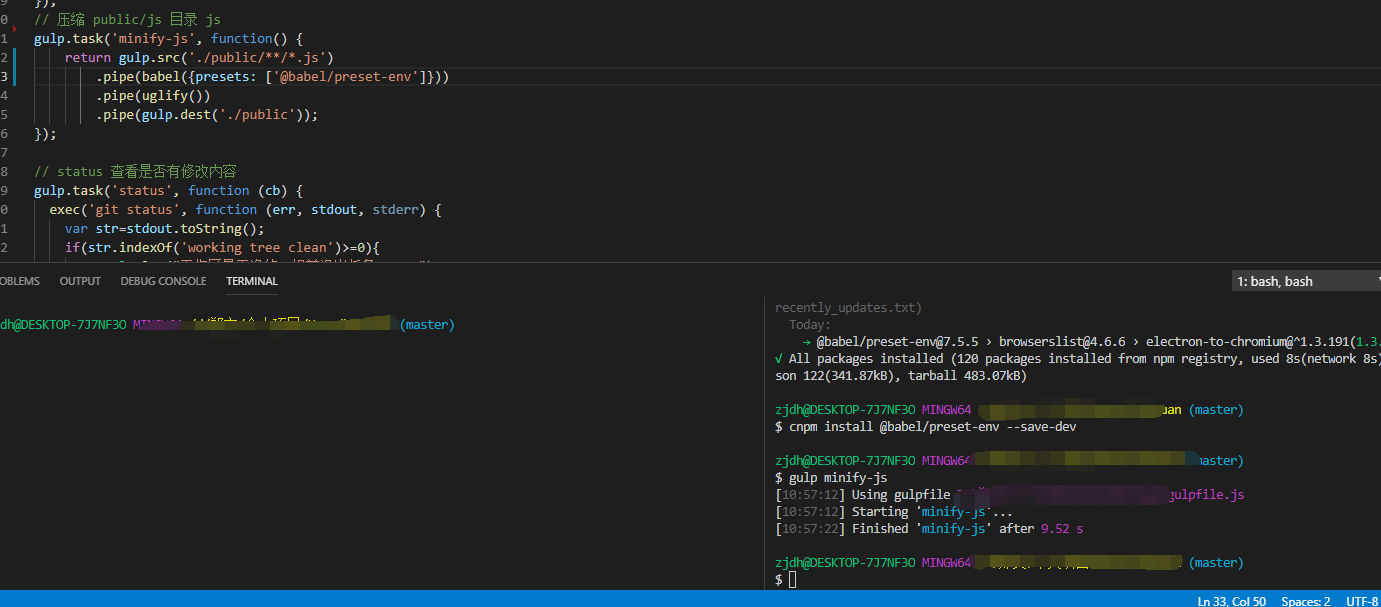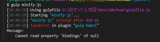 代码也很简单,就是把public中的js代码先把es6语法使用babel转成es5语法,然后再压缩,昨天还好好的,今天就不能使用了,简直郁闷透顶。出现了:“ Cannot read property ‘bindings’ of null” 错误。