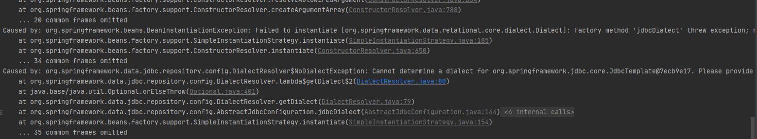 Error creating bean with name 'jdbcDialect' defined in class path resource [org/springframework/boot/autoconfigure/data/jdbc/JdbcRepositoriesAutoConfiguration$SpringBootJdbcConfiguration.class]: Bean instantiation via factory method failed; nested exception is org.springframework.beans.BeanInstantiationException: Failed to instantiate [org.springframework.data.relational.core.dialect.Dialect]: Factory method 'jdbcDialect' threw exception; nested exception is org.springframework.data.jdbc.repository.config.DialectResolver$NoDialectException: Cannot determine a dialect for org.springframework.jdbc.core.JdbcTemplate@738a39cc. Please provide a Dialect.