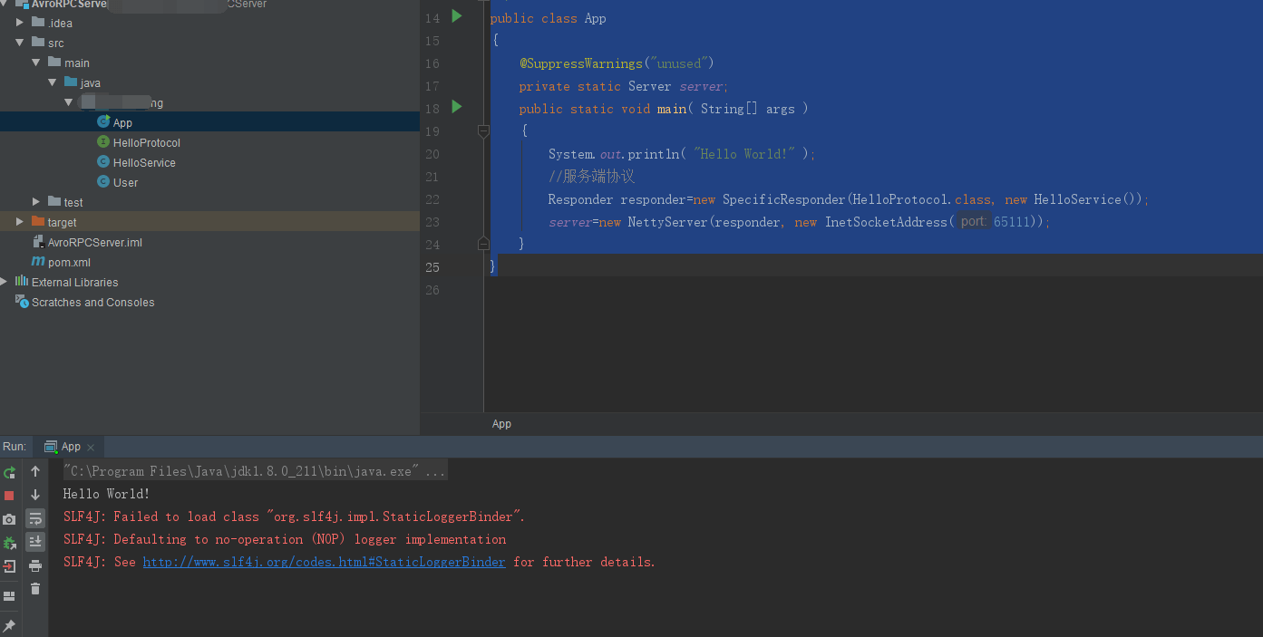 public class App { @SuppressWarnings("unused") private static Server server; public static void main( String[] args ) { System.out.println( "Hello World!" ); Responder responder=new SpecificResponder(HelloProtocol.class, new HelloService()); server=new NettyServer(responder, new InetSocketAddress(65111)); } }