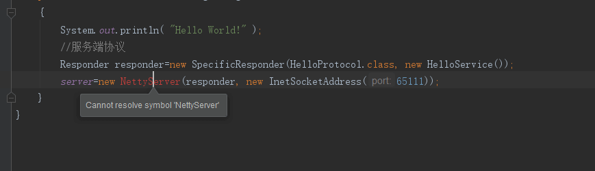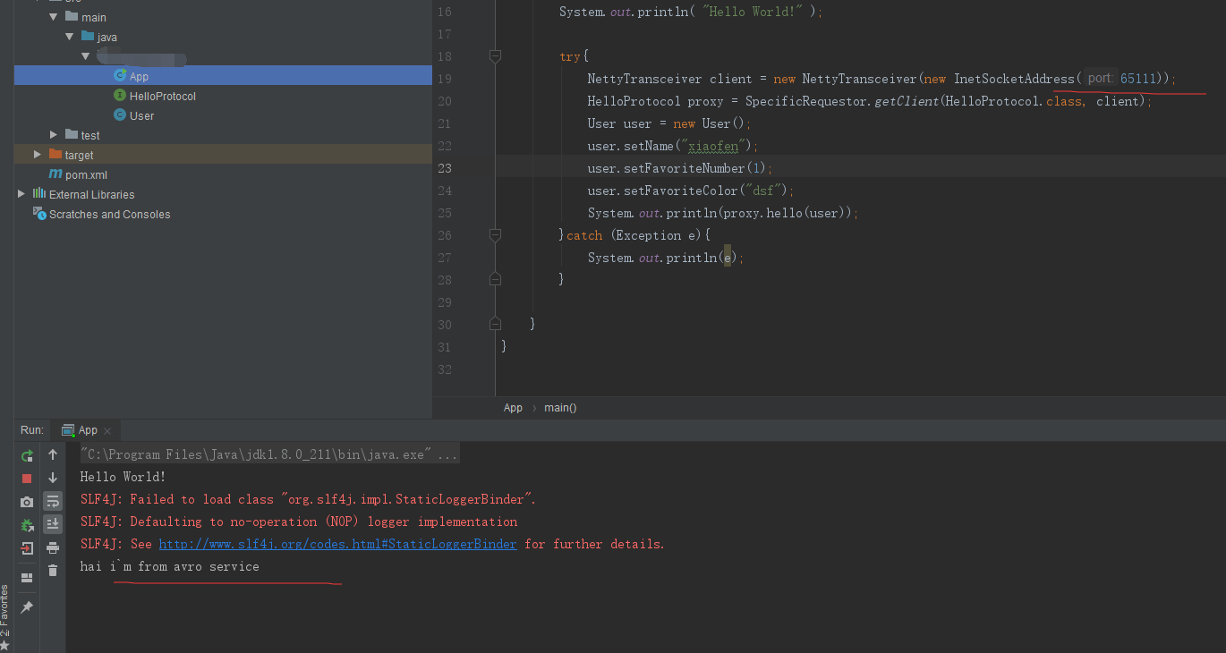 try{ NettyTransceiver client = new NettyTransceiver(new InetSocketAddress(65111)); HelloProtocol proxy = SpecificRequestor.getClient(HelloProtocol.class, client); User user = new User(); user.setName("xiaofen"); user.setFavoriteNumber(1); user.setFavoriteColor("dsf"); System.out.println(proxy.hello(user)); }catch (Exception e){ System.out.println(e); }