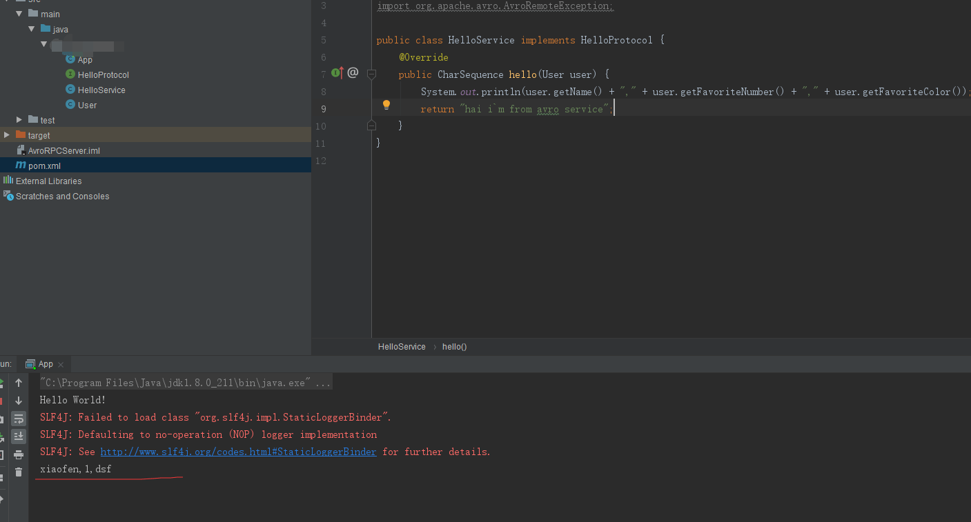 public class HelloService implements HelloProtocol { @Override public CharSequence hello(User user) { System.out.println(user.getName() + "," + user.getFavoriteNumber() + "," + user.getFavoriteColor()); return "hai i`m from avro service"; } }