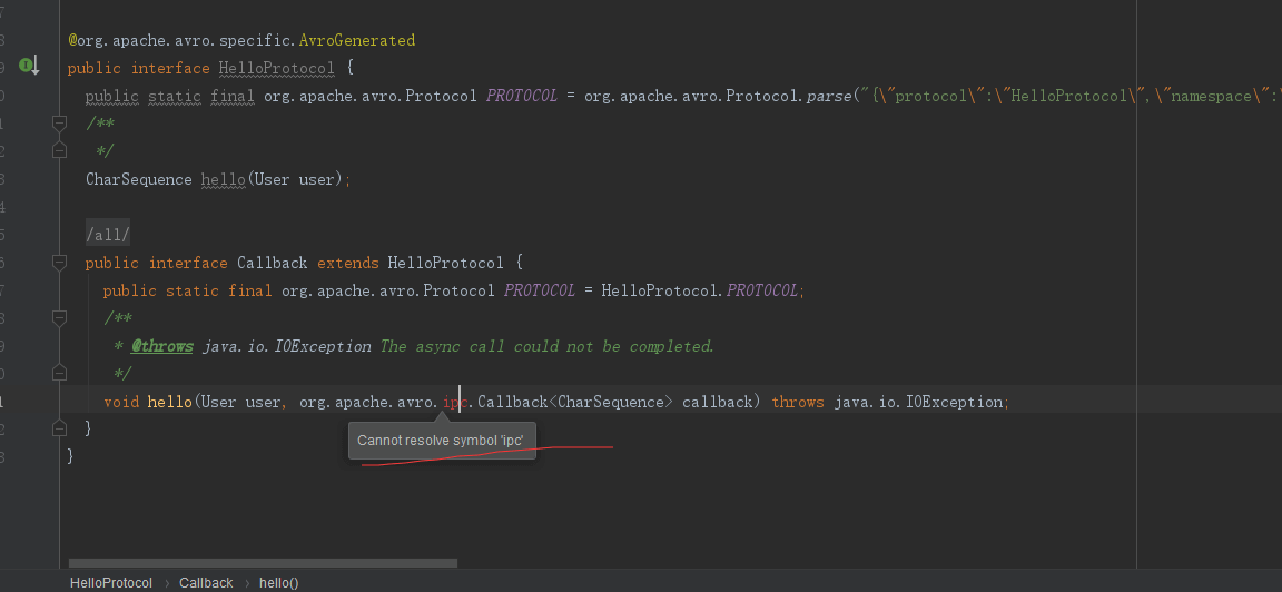 同服务端一样,将avro-tool生成的User.java和HelloProtocol.java复制到工程目录中,注意包路径。