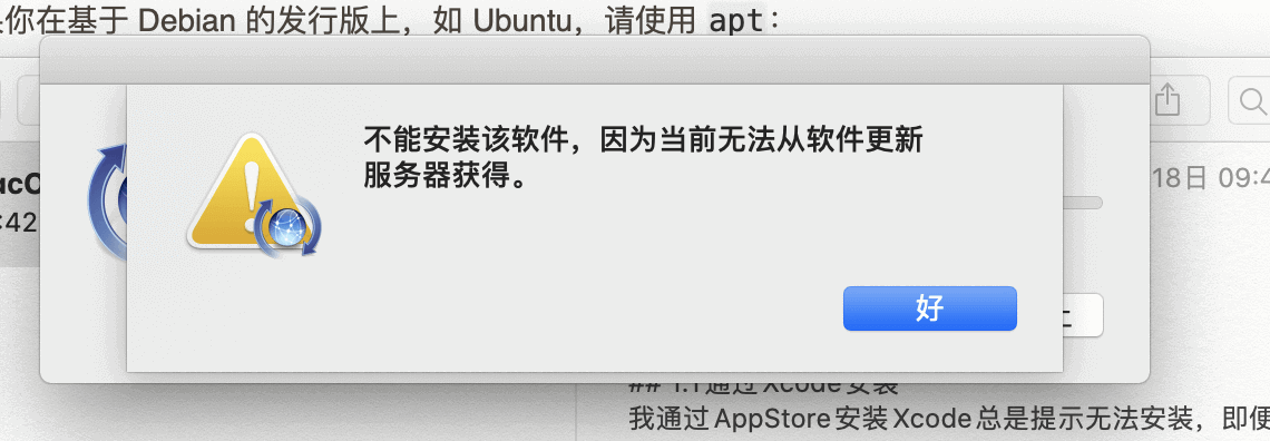 我通过AppStore安装Xcode总是提示无法安装,即便我科学上网了也还是不行。
