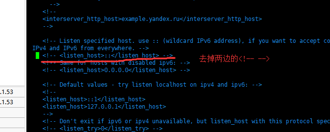 (3) 编辑 /etc/clickhouse-server/config.xml 文件 找到下面内容,将listen_host两边的注释打开