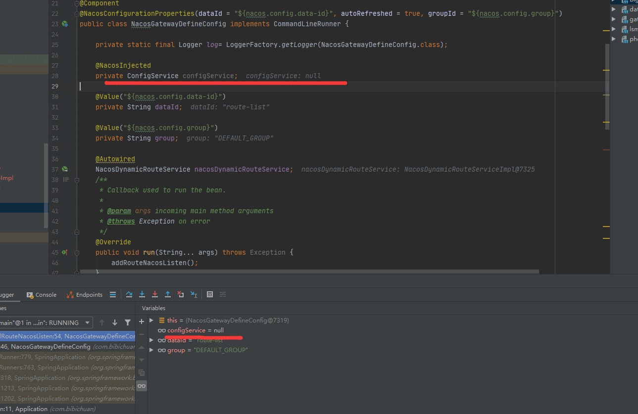 1 2 3 4 5 6 7 8 9 10 11 12 13 14 15 16 17 18 19 20 21 22 23 24 25 26 27 28 29 30 31 32 33 34 35 36 37 38 39 40 41 42 43 44 45 46 47 48 49 50 51 52 53 54 55 56 57 58 59 60 61 62 63 64 65 66 67 68 69 70 71 72 73 74 75 76 77 78 79 80 81 82 83 84 85 86 87 88 89 90 91 92 package com.bibichuan;import com.alibaba.cloud.nacos.NacosConfigProperties;import com.alibaba.fastjson.JSON;import com.alibaba.nacos.api.annotation.NacosInjected;import com.alibaba.nacos.api.config.ConfigService;import com.alibaba.nacos.api.config.annotation.NacosConfigurationProperties;import com.alibaba.nacos.api.config.listener.Listener;import com.alibaba.nacos.api.exception.NacosException;import org.slf4j.Logger;import org.slf4j.LoggerFactory;import org.springframework.beans.factory.annotation.Autowired;import org.springframework.beans.factory.annotation.Value;import org.springframework.boot.CommandLineRunner;import org.springframework.cloud.gateway.route.RouteDefinition;import org.springframework.core.annotation.Order;import org.springframework.stereotype.Component;import java.util.List;import java.util.concurrent.Executor;@Component @NacosConfigurationProperties(dataId = "${nacos.config.data-id}", autoRefreshed = true, groupId = "${nacos.config.group}") public class NacosGatewayDefineConfig implements CommandLineRunner { private static final Logger log= LoggerFactory.getLogger(NacosGatewayDefineConfig.class); @Autowired NacosConfigProperties nacosConfigProperties; @Value("${nacos.config.data-id}") private String dataId; @Value("${nacos.config.group}") private String group; @Autowired NacosDynamicRouteService nacosDynamicRouteService; @Override public void run (String... args) throws Exception { addRouteNacosListen(); } private void addRouteNacosListen () { try { ConfigService configService = nacosConfigProperties.configServiceInstance(); String configInfo = configService.getConfig(dataId, group, 5000 ); log.info("从Nacos返回的配置:" + configInfo); getNacosDataRoutes(configInfo); configService.addListener(dataId, group, new Listener () { @Override public void receiveConfigInfo (String configInfo) { log.info("Nacos更新了!" ); log.info("接收到数据:" +configInfo); getNacosDataRoutes(configInfo); } @Override public Executor getExecutor () { return null ; } }); } catch (NacosException e) { log.error("nacos-addListener-error" , e); e.printStackTrace(); } } private void getNacosDataRoutes (String configInfo) { List<RouteDefinition> list = JSON.parseArray(configInfo, RouteDefinition.class); list.stream().forEach(definition -> { log.info("" +JSON.toJSONString(definition)); nacosDynamicRouteService.update(definition); }); } }