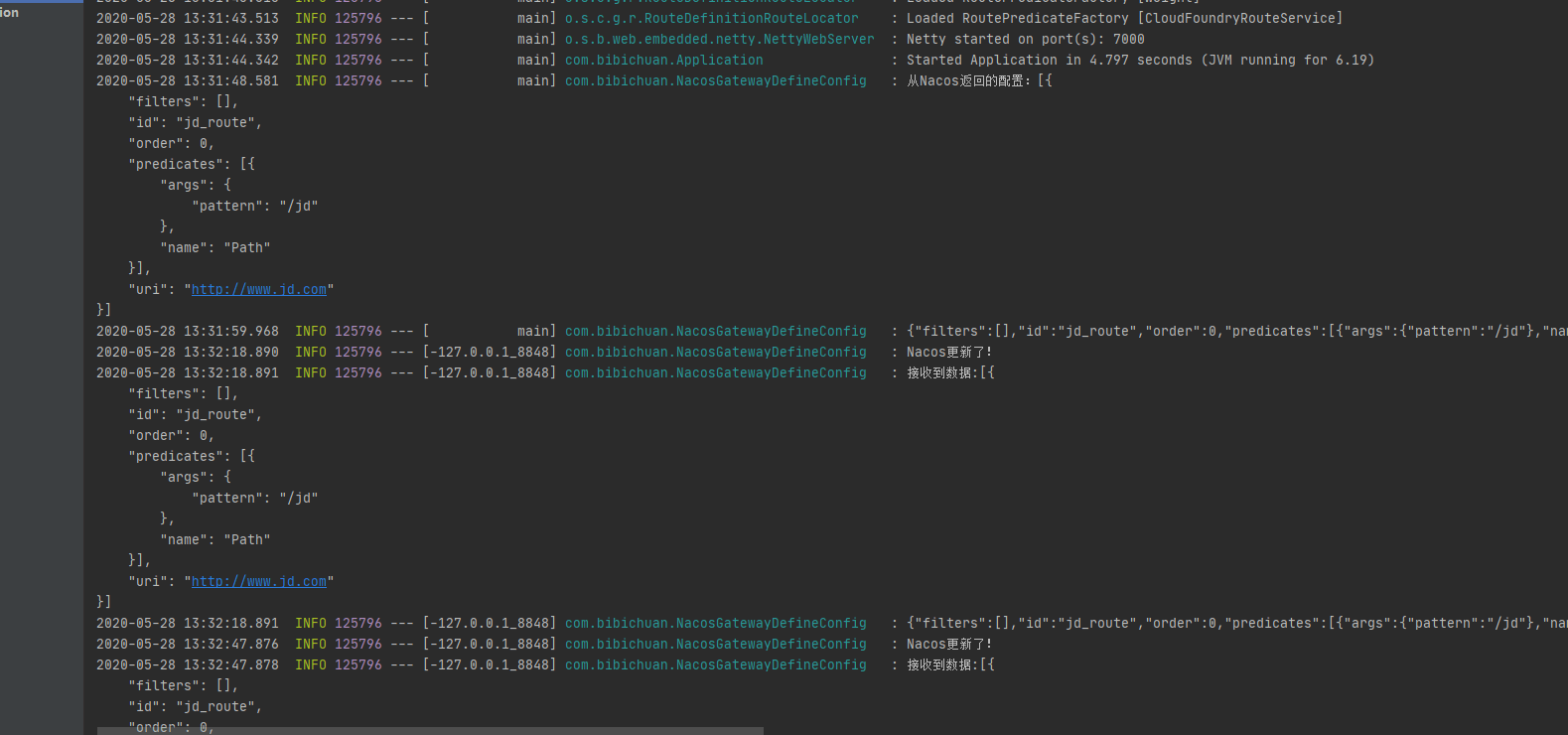 5.启动应用程序 启动应用程序,就可以看到从nacos配置中心中获取到了路由配置,然后在配置中心中修改了配置,路由也会相应的更新了。