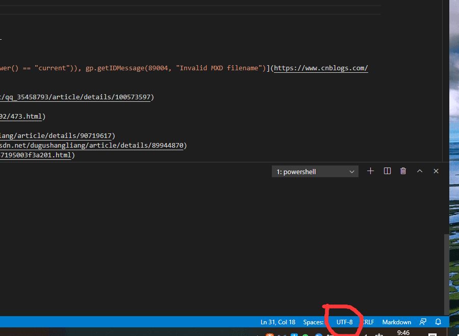 (2) 打开的VSCode编辑器,找到右下角有个UTF-8(如果已经显示了是GB2312,直接跳到第五步),点击打开文件编码设置选项。