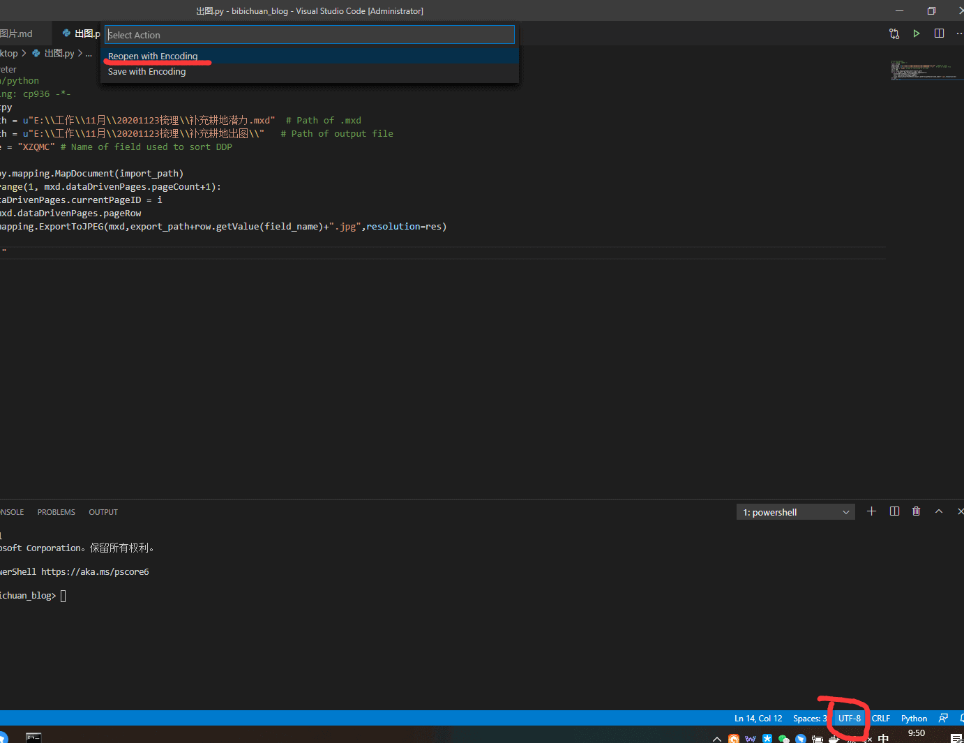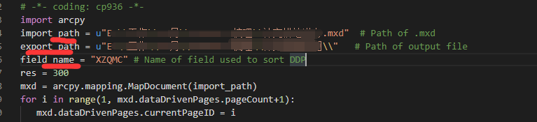 (6) 根据需要,修改代码中的import_path和export_path分别为mxd所在位置,以及需要出图的文件夹,需要出图(即保存出图后图片)的文件夹,最后要加双斜杠;修改field_name字段名称,即属性表中可以标志图片名称的字段,保存(Ctrl+S)并关闭。