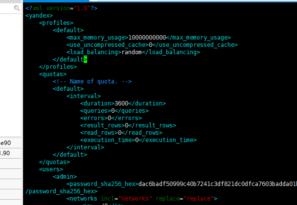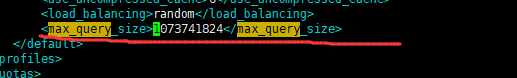 这其实是因为查询语句特别的大造成的(我的in()里面有5万多个id号),而默认的max_query_size最大是256 KiB。打开/etc/clickhouse-server/user.d/newuser.xml(我新建的自己的newuser.xml配置文件),也可以是其他的users.xml,其中有两个部分,一部分是profiles和quotas。profiles保存了用户的配置,quotas保存了用户的配额。配额使您可以限制一段时间内的资源使用,或仅跟踪资源的使用。像max_query_size这种配置,就需要在profiles部分中配置。