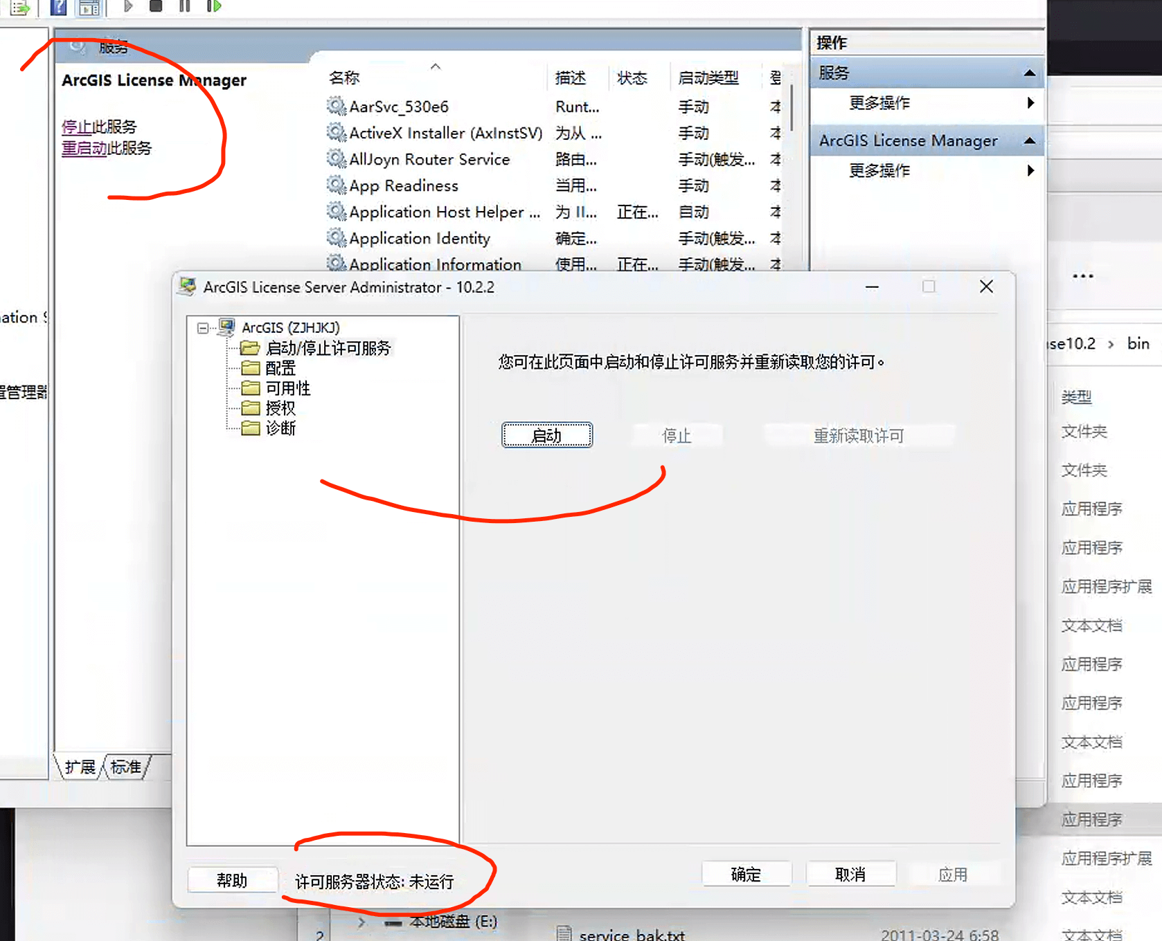 (1) 其实我没有解决,但是我发现了一个规律,就是我替换了 service.txt 文件之后,没一会 license 就关闭了,我再次把 service.txt 复原,这个时候还是启动不了。需要到 计算机管理 -> 服务-> ArcGIS License Manager 这个服务停掉,这个时候,这个 LSAdmin.exe 就可以重新启动了。