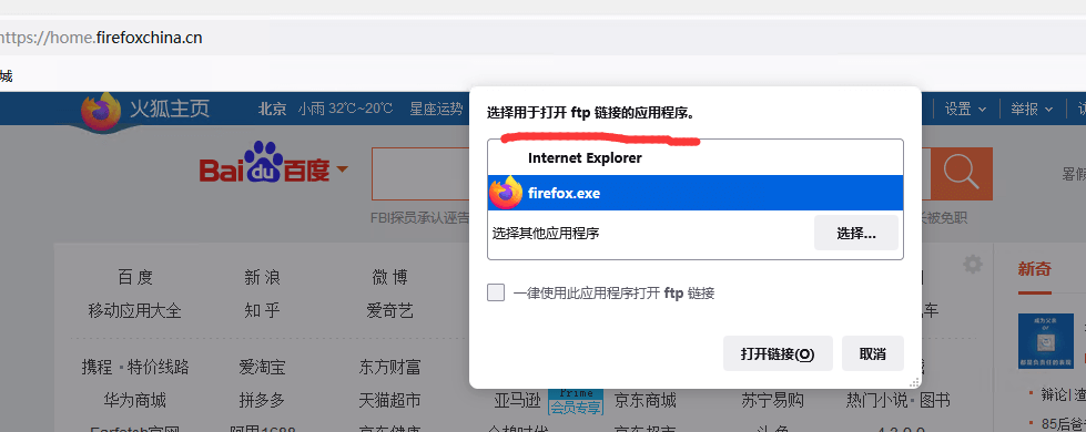 配置完成之后,在浏览器打开:ftp:127.0.0.1:21 站点,不知道为什么,现在的浏览器都不允许直接打开ftp站点进行浏览了,打开ftp站点,都会跳出一个选择框,让选择用什么程序打开ftp链接,但是选择了使用firefox打开之后,就没有反应了,不会像以前一样,直接可以浏览站点底下的文件及文件夹了。
