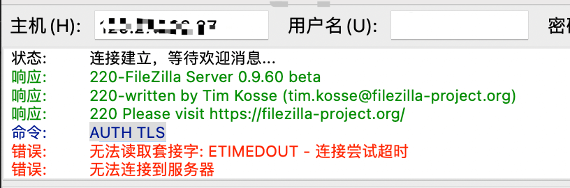 在阿里云的ecs主机上安装里FileZilla Server服务器,并设置了21端口开放,但是在外网(小区的移动宽带)使用Mac客户端的时候,出现了连接成功,但是运行到 AUTH TLS 之后,就断开了。