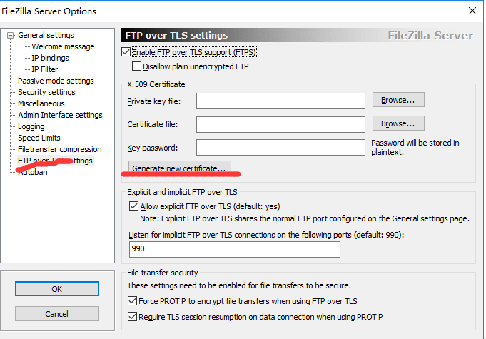 在服务器设置中,选择FTP over TLS settings,生成相应的证书和密钥,还需要开放990端口。证书的ip地址,我就写了本地地址,这个没有关系,可以随便指定,只要你客户端进行连接的时候,选择信任就好了。