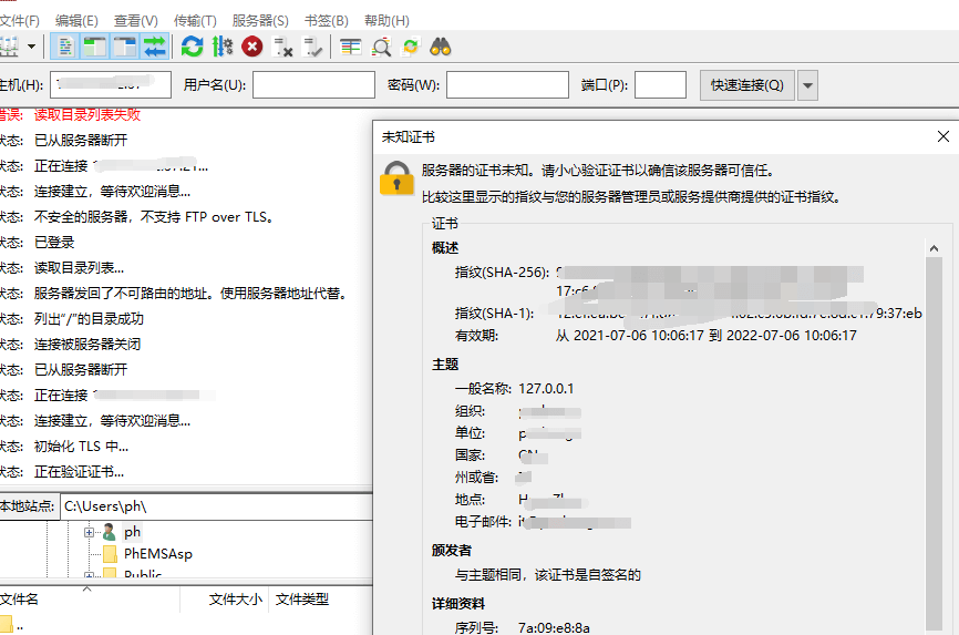 1.FileZilla FTP && TLS的连接设置 这篇文章详细说明了如何进行TLS设置,已经生成证书,我这里没有填写密码,其实也可以的。