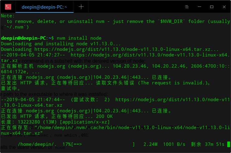 终端执行命令:nvm install node,会安装最新版的nodejs,中国下载起来很慢,耐心等会。