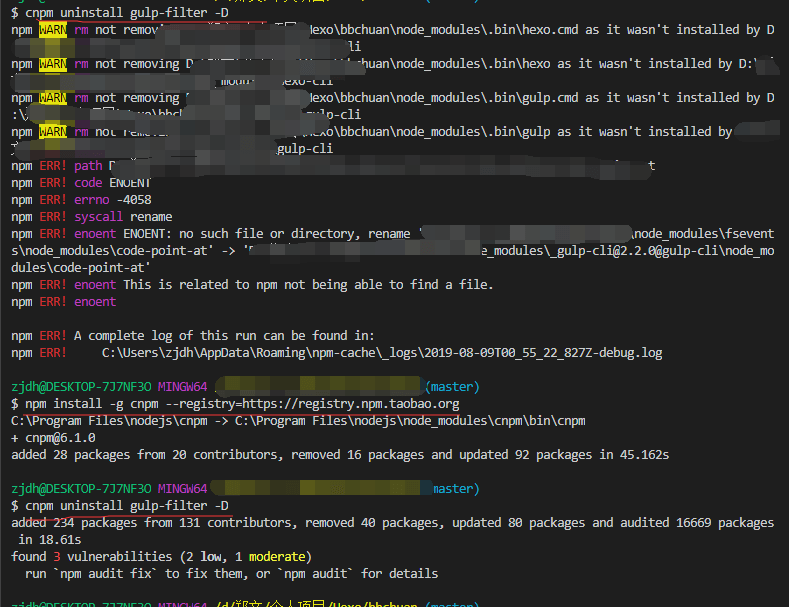 如上图,使用cnpm uninstall 卸载某个包时,总是报错:”Error: ENOENT: no such file or directory”,安装的时候也没什么毛病啊,卸载的姿势也是正确的啊。最后,通过重新设置cnpm后,可以解决这个问题。