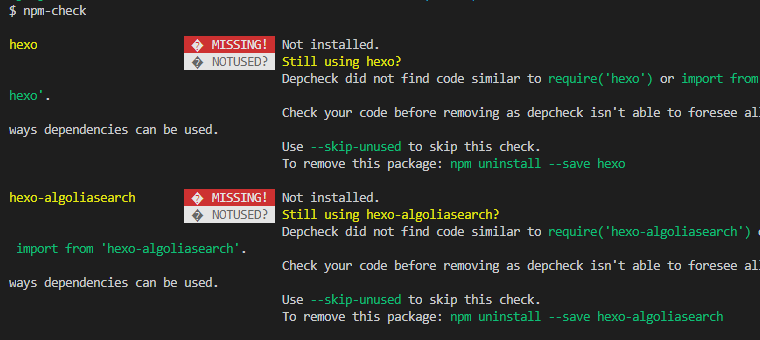 使用上面的命令,更新全部的包,可能会出现错误,所以我选择了另一个插件npm-check。他可以检查哪些依赖包更新了,哪些没有更新,也可以通过手动更新某一个或者时全部依赖包。