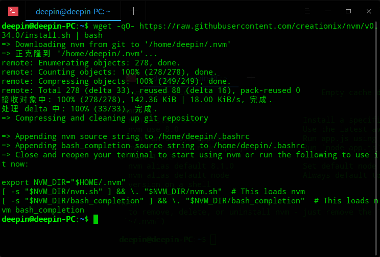 打开终端,执行wget -qO- https://raw.githubusercontent.com/creationix/nvm/v0.34.0/install.sh | bash